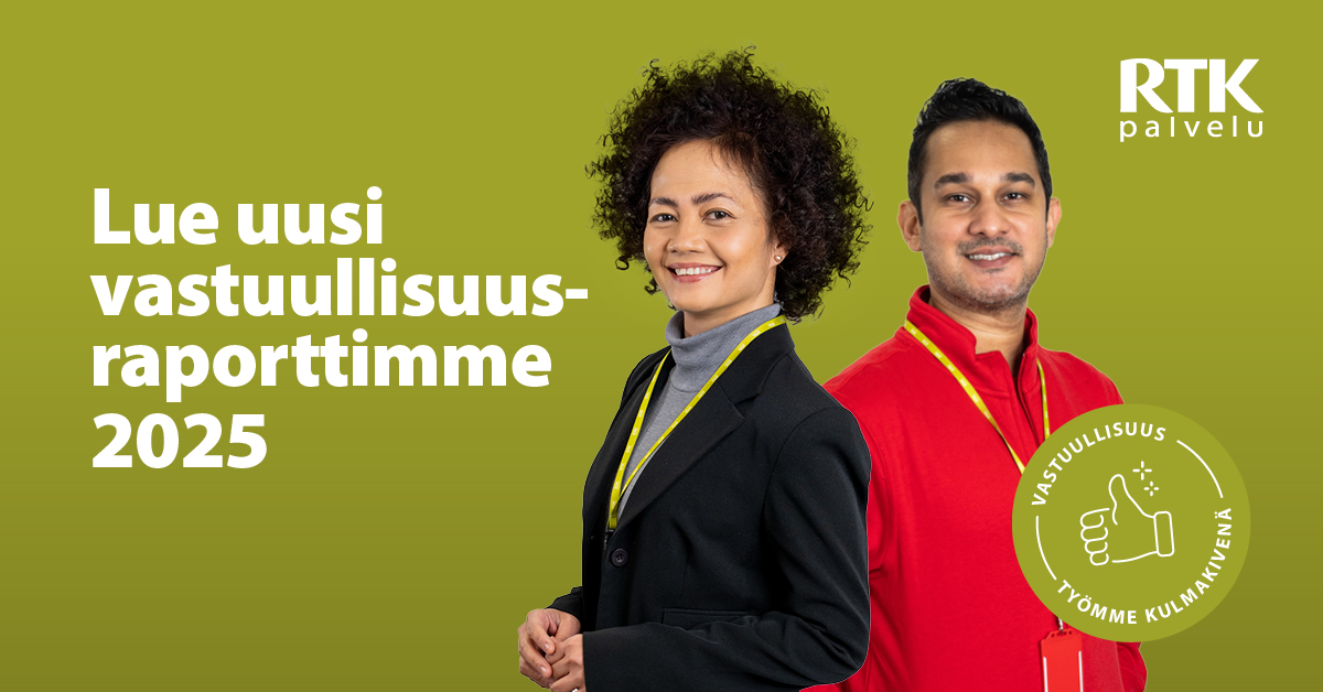 RTK-Palvelun vastuullisuusraportti 2025 on nyt julkaistu! Henkilöstö ja asiakastyytyväisyys ovat kaiken toimintamme keskiössä – myös vastuullisuuden. Raportti on ensimmäistä kertaa toteutettu VSME-standardia noudattaen.